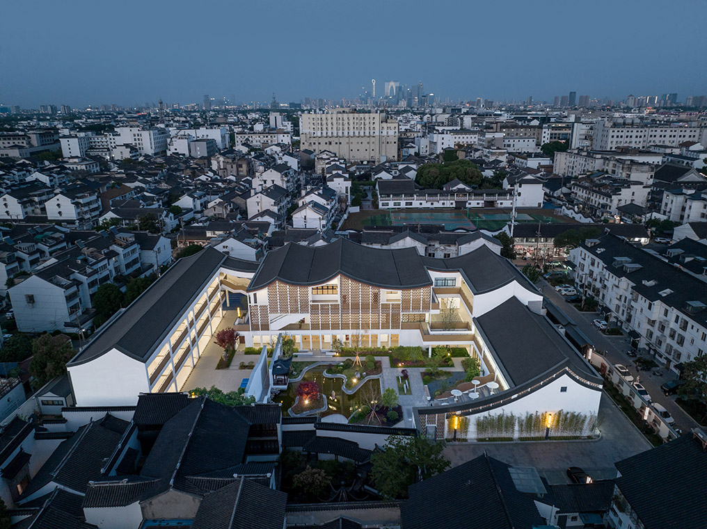 項目秉承“傳承與創新”的理念,在尊重古城風貌和保護周邊控保建筑的前提下,探索新中式學校建筑風格。設計通過對地下空間的利用、相同尺度空間的疊合、立面手法削弱大體量空間尺度感等方式,合理巧妙的把新校區大尺度功能空間與古城區小尺度街坊融合在一起,彼此間并不突兀。建筑通過圍合的方式在場地內部留出一處內院,與控保建筑隔墻呼應,結合古城風貌特色打造校園文化園林,讓新建學校與古城街坊融為一體,打造功能完善、環境優美的現代化校園。