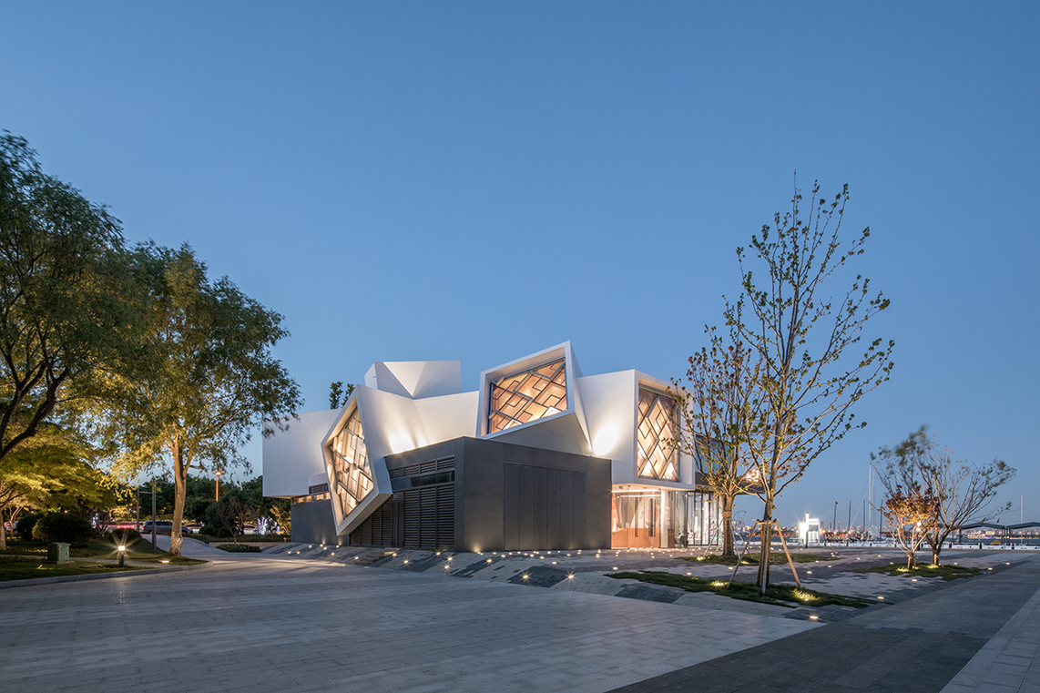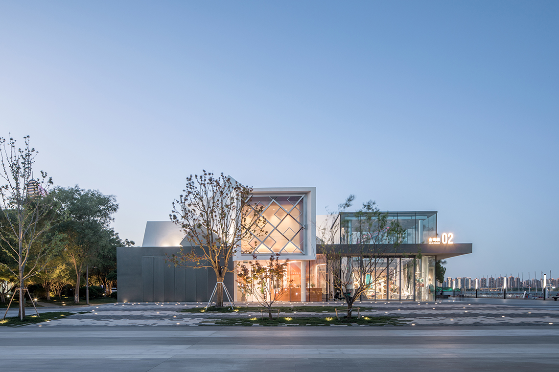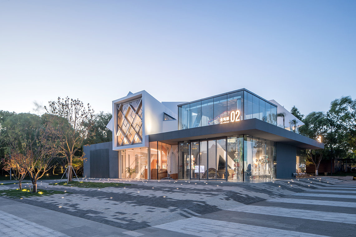 具有雕塑感的純白色交錯的筒體在黑盒子底座中有機的生長出來,以單純的幾何體美感與自然環境對比呼應。二層之上白色筒體“切斷”的界面為幕墻花窗,以蘇州傳統花窗為設計意向并結合數碼印刷網點彩色玻璃,非但未筑起隔閡,反以獨特之姿,模糊了室內外世界的界限,讓金雞湖畔的旖旎風光,悠悠然滲透入這方靜謐空間。