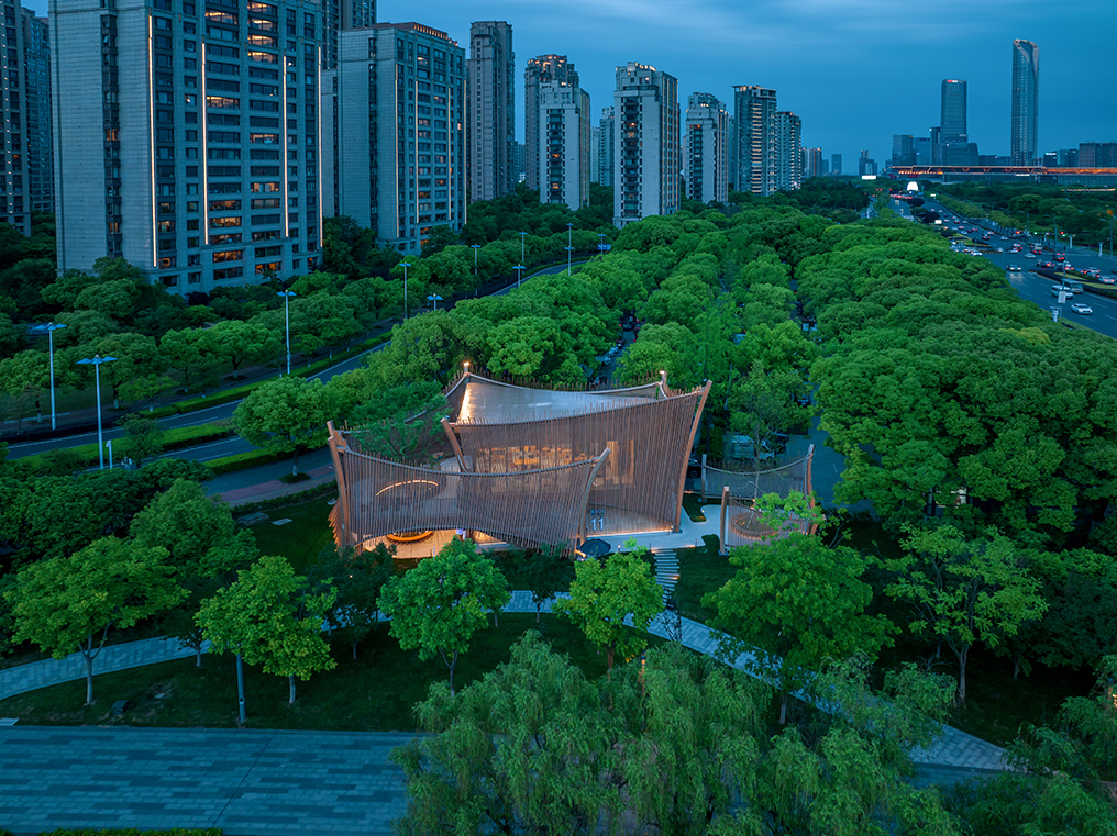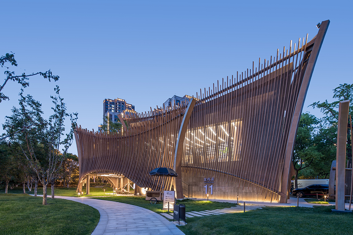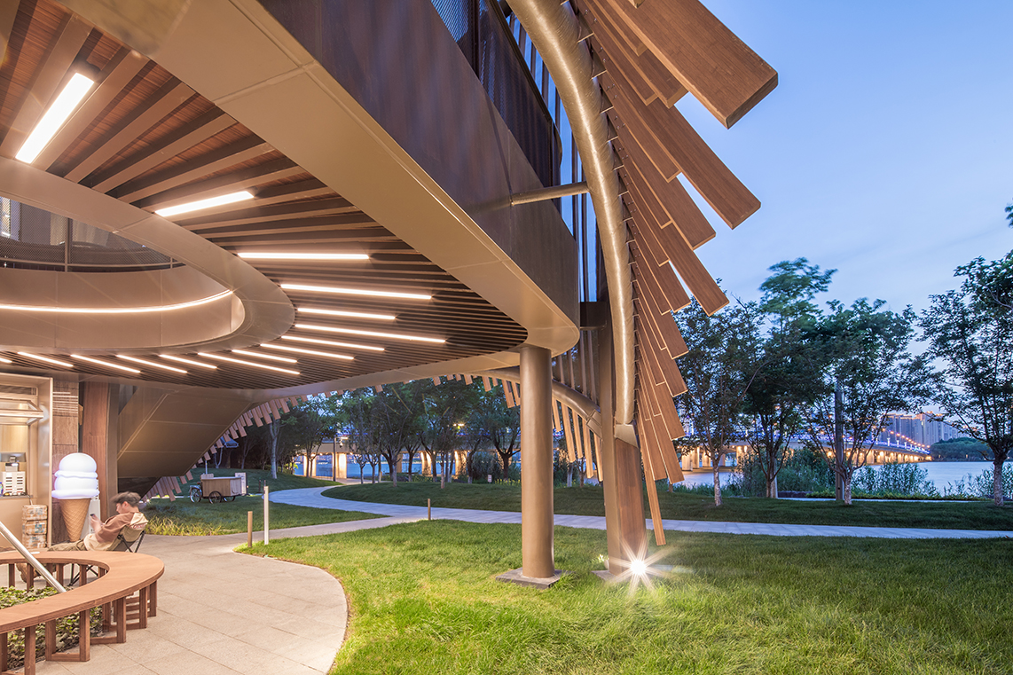 設計以自然幾何為語,整體外部木色參數化設計表皮環繞,內襯相近顏色金屬網,以參數化設計的雕塑感表皮包裹內部建筑主體的形式創造極佳的趣味性及光影感,與周邊樹林形成呼應的強調了建筑設計的在地性。在這里,每一步都踏著綠意,每一次呼吸都飽含清新。